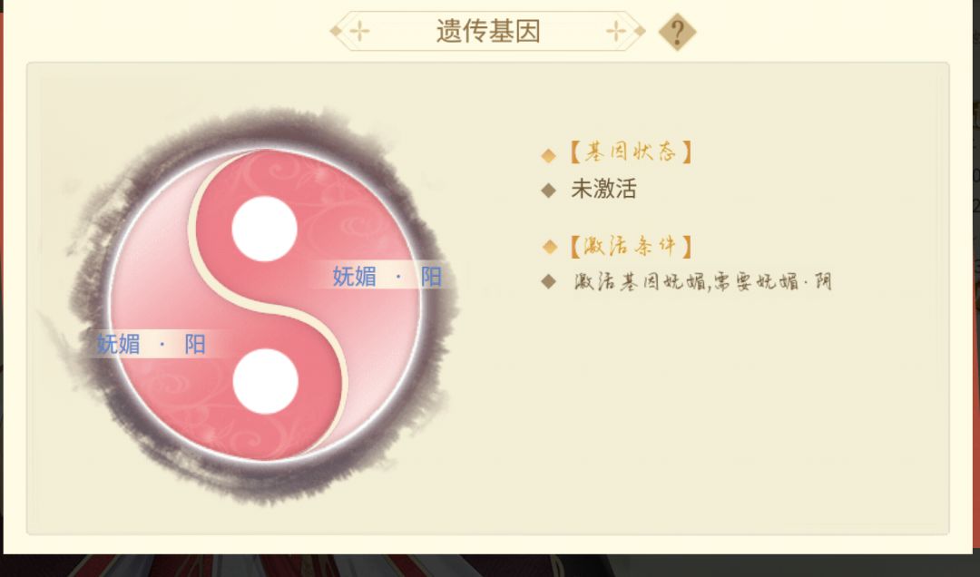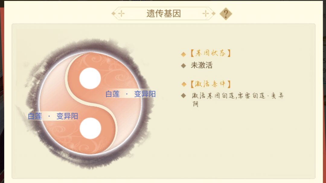 1.首先要知道的是每个人自带两种基因,当是同种基因的阴和阳组合的时候,才能激活该基因。(如图p1-2激活的妩媚基因和白莲基因)