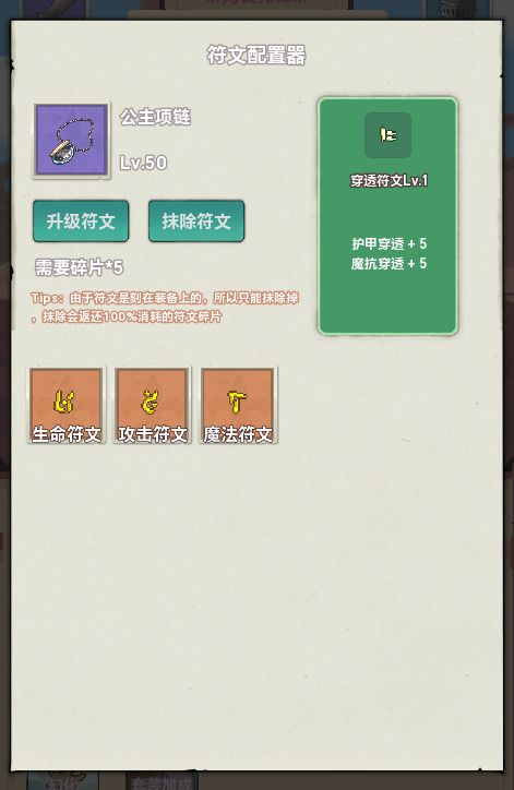 新版本为了让玩家属性更容易闯关,我添加了符文系统,为装备额外提供一些辅助属性。