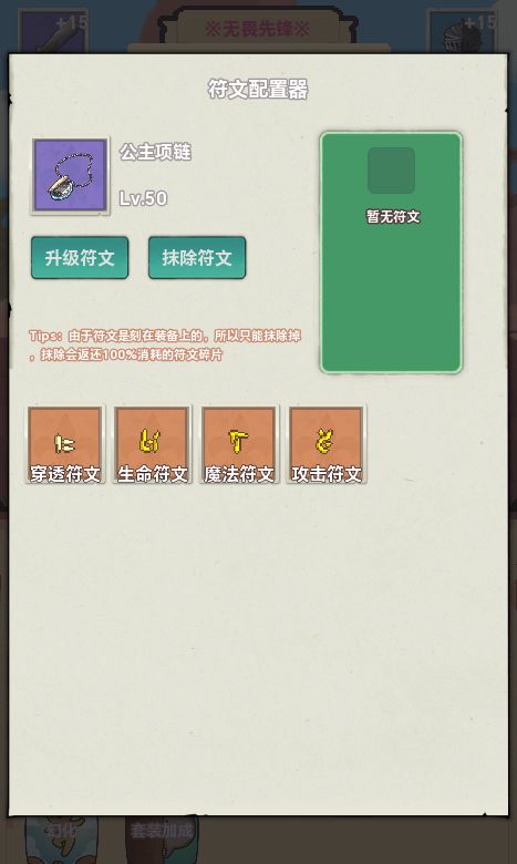 刻印完成后会为装备添加一条符文属性,可以选择升级或者抹除,每次升级会提高当前符文属性,抹除则移除装备的符文属性,同时返还所有消耗的符文碎片: