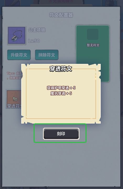 当你获得符文后会在下面区域显示你的符文,点击任意符文选择刻印即可。