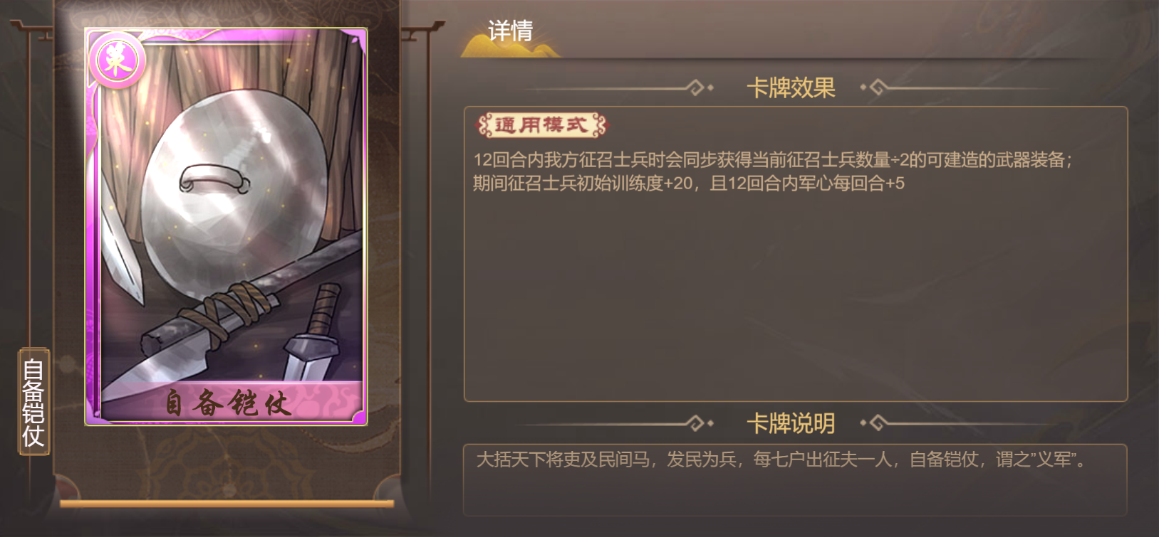 这张策卡在生效期间可以按照征召士兵与可建造装备2:1的比例获得大量装备。