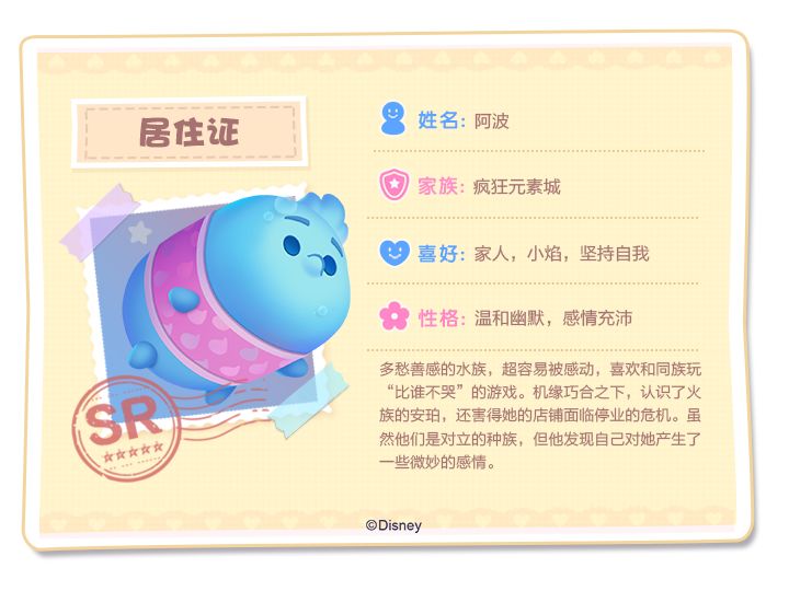 阿波是元素城中的水族男生,为水务部门稽查员。个性慢悠悠,理性而和温和,富有幽默感,同时也特别容易动感情,稍有刺激就会感动得流眼泪。