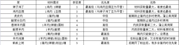 重点推荐送菜,准备的说是肉菜。其他菜他们不吃(刁民!鱼肉也不行,必须是猪肉,鸭肉,鸡肉,羊肉做的菜!!)以下用一张表格推荐大家做的几种菜和优先级,然后和大家说下肉的获取方式,猪肉通过特殊订单获取,一天获取量基本就那么多,所以后期的话做蚂蚁上树粉丝完全够,前期可以做我推荐的另外两种菜,鸭肉也是特殊订单获取,只能做一种菜,有就做吧,没得选。重点是鸡肉和羊肉,通过鸡圈和羊圈获取,每获取6次鸡蛋和羊毛就会获得1块。注意!以下是攻略的重中之重,鸡肉和羊毛的获取量是按次获取的,就算你鸡蛋和羊毛触发翻倍获取了,也只能算1次,另外鸡肉和羊毛的获取不受翻倍概率影响,固定获得1。所以在学堂升级时,请大家把这两个的缩短时间等级拉满!!翻倍概率一个也不要点,因为鸡蛋和羊毛后期都是溢出的。