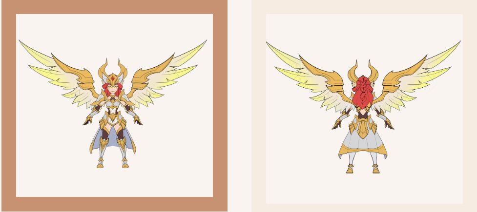 但我们仍然保留了羽翼来体现她的神性,这也与角色的定位暗合:武神的本质不是一味的战斗,而是为了去守护重要的东西。