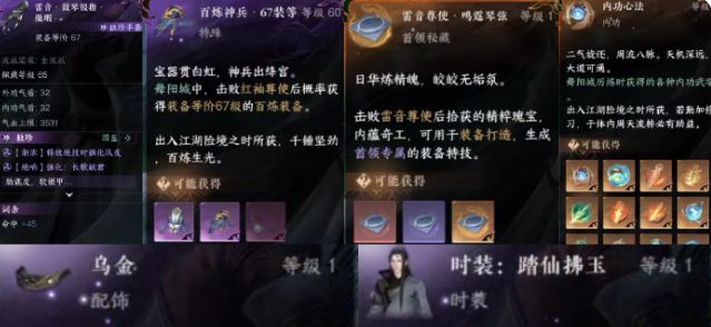 通关奖励:独珍手套/鸣霆琴弦/金色内功/百炼神兵/配饰金乌/时装上衣