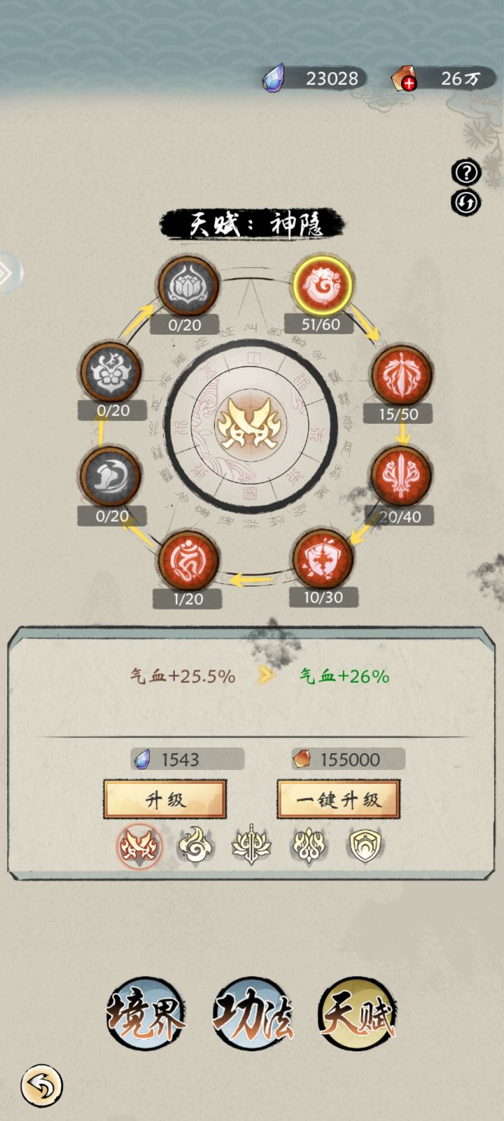4.灵活一些调整阵容搭配天赋和功法,职业共有5个,我们在前期的资源也不允许我们五个职业都散养。为了战力我们可以看着阵容进行强化,比如旱魃,琼霄,帝江这三个都是神隐,如果你养了这三个,那升级天赋和功法肯定是升级神隐领域的属性获得的战力收益最大。