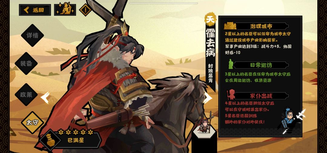 从保底战力提升来看,单独使用霍去病,前期也能够给你提供接近50的无消耗战力。(开局200战力情况下),由于政策具有一定的成长性,且可以通过适当的名臣配合以及霍去病本身太守效果尽可能拉高基础战力。所以正常情况下,收益是有保障的。(一般用两三次主要是前期开局破局,中后期收尾。)