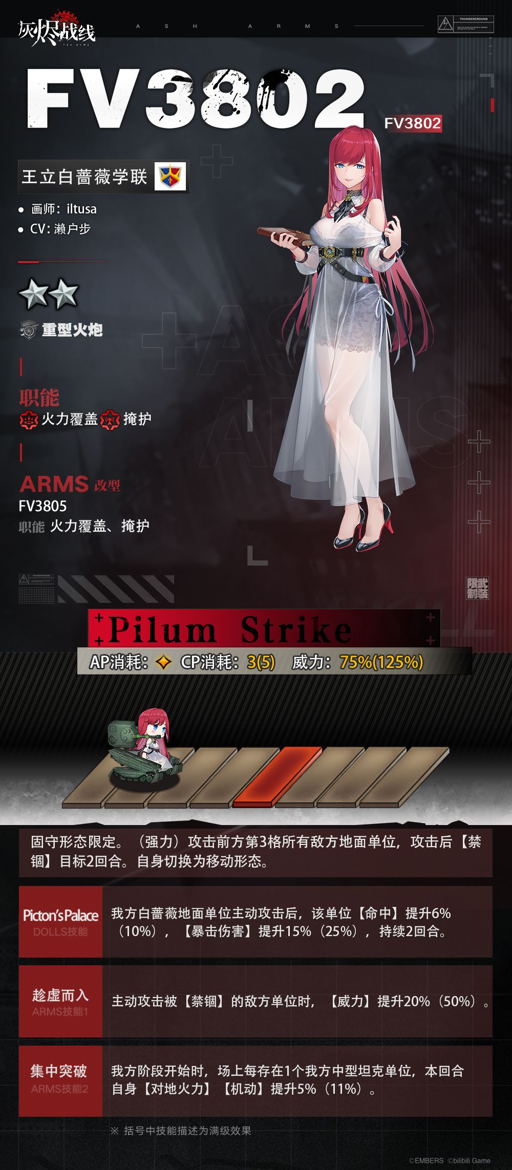 正如您在资料中看到的,FV3802是王立白蔷薇学联最新锐的自行火炮DOLLS,不仅是整合了许多大胆设计与先进技术,其温柔优雅的淑女性格也是该学联悠久校风的完美体现。然而事实果真如此吗?为何有如此漂亮履历的DOLLS没有在王立白蔷薇所重用,而是被派遣到维修会来进行实战验证?对于这位完美淑女的测验与调试工作,可以想见会是远比想像中还要更为艰难的挑战。