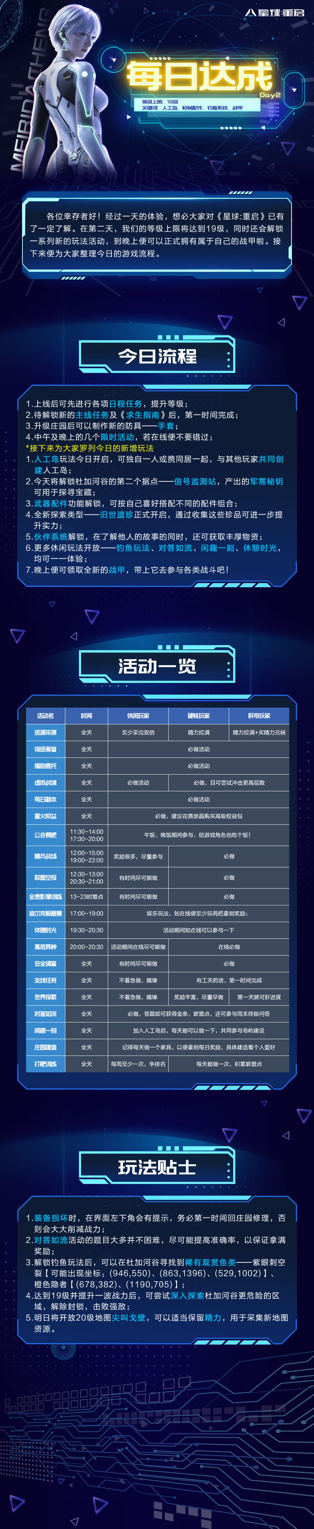 经过一天的体验,想必大家对《星球:重启》已有了一定了解。在第二天,我们的等级上限将达到19级,同时还会解锁一系列新的玩法活动,到晚上便可以正式拥有属于自己的战甲啦。接下来便为大家整理今日的游戏流程。