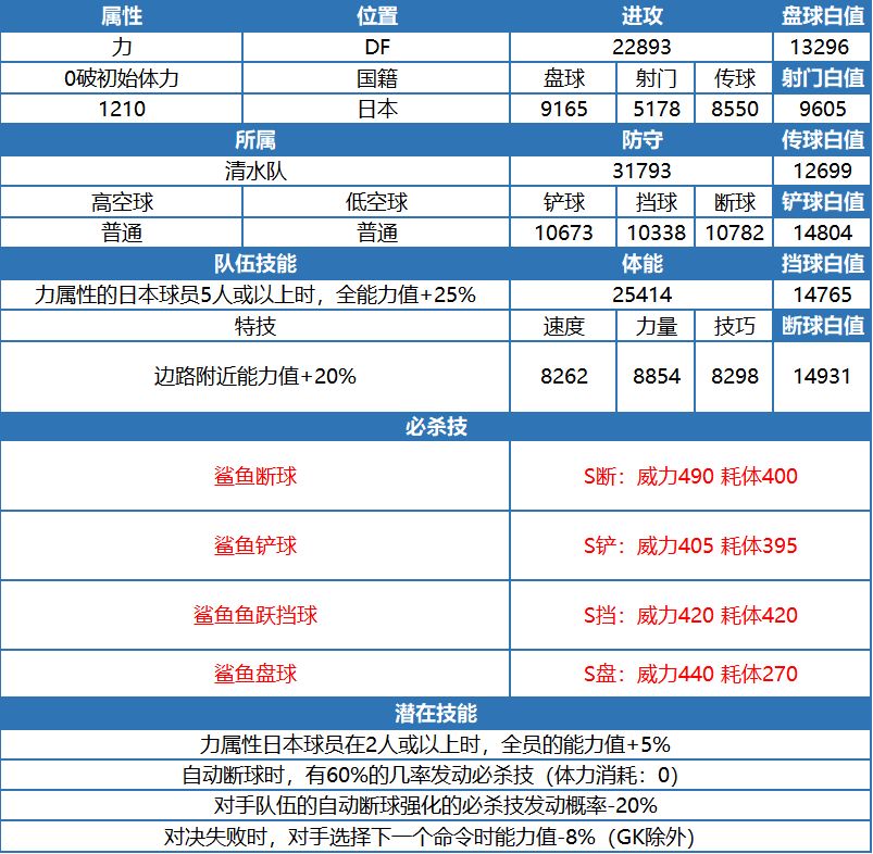 主要能力:边线大师20%、8%混战的代价、60%自动断、减对面20%自动断。