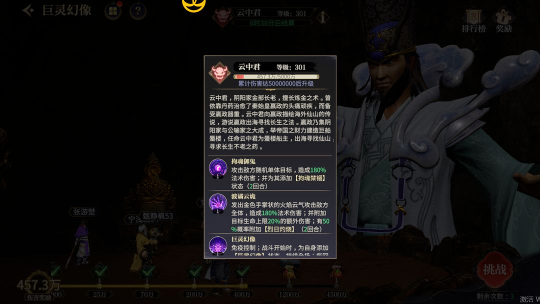 云中君这个BOSS是打不死的,它血量的多少是依旧全服所有参与此玩法的少侠对其造成的伤害多少而决定的,从图上看这个301级的BOSS血量是5000W,当某一天所有参与此玩法