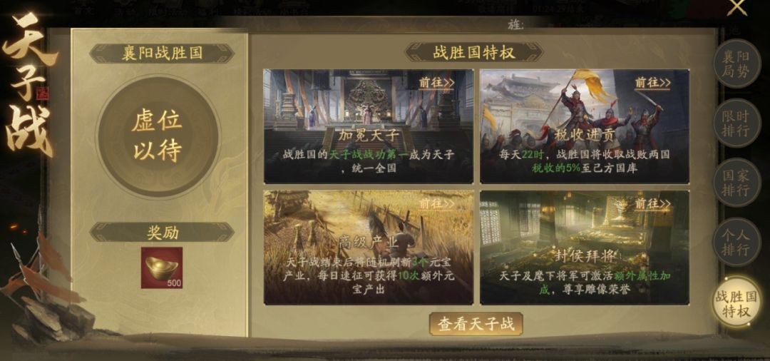 在全新的国战——天子战中,各位主公将会代表本国出征攻占三个国家的中心城池——襄阳。在天子战中战胜的国家,战功第一的主公将加冕为天子。