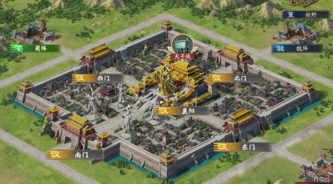 作为被争夺的对象,襄阳城分为东南西北四个不同的城门,均为进入襄阳内部的必经之路。当一个国家占领每个城门不仅可拦截其他国家通过进入襄阳,还可以获得战斗加成,并最后结算时将获得相应加分。