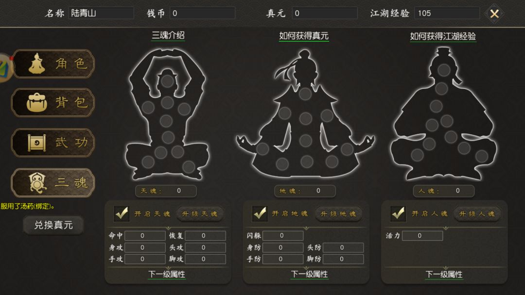 三魂系统:分别为天、地、人三魂。消耗真元、江湖经验、钱币升级