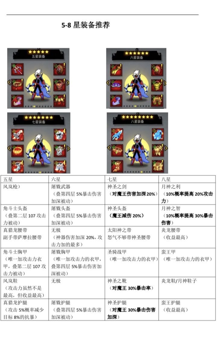 装备推荐也是基于当前的版本和自己账号情况,并不能 完全通用,鉴于高星特效装备难以获得,对于 9 星以上的推 荐装备,会给予替代方案。推荐的装备为魔王向,竞技场装备会在竞技场部分展示。
