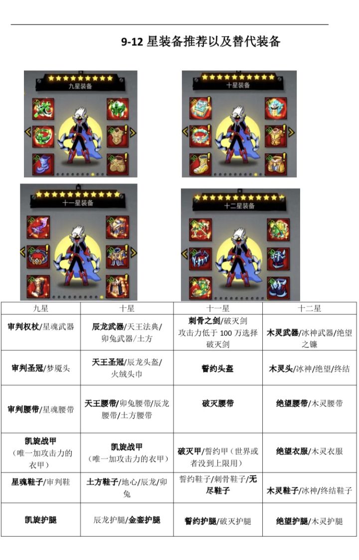 9-12 星粗体标记的是首先推荐的装备,后面的是替换装备。 1 经过测试,天王头>辰龙头盔(应该是内置 cd 的原因)天 王腰带>卯兔腰带>辰龙腰带(同理)