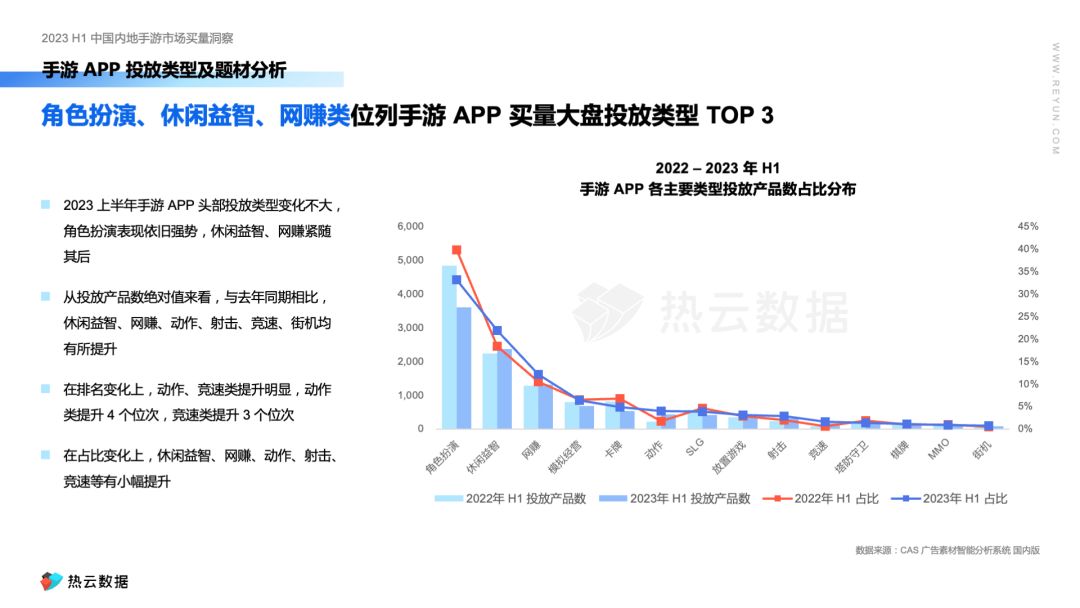 从参与投放的头部手游类型来看,角色扮演、休闲益智和网赚类手游依旧占比较高;从投放产品数绝对值来看,与去年同期相比,休闲益智、网赚、动作、射击、竞速、街机等品类手游投放数均有所提升。