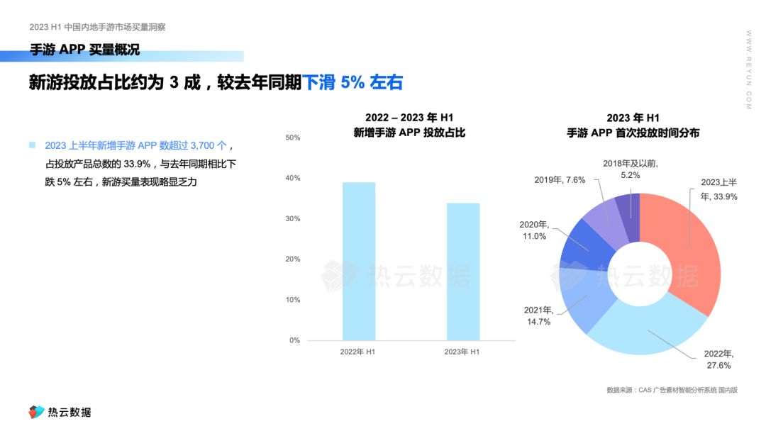 同时,2023上半年投放的新游超过3700款,占投放总量的33.9%,较去年同期下滑约5%,新品买量表现较为乏力。