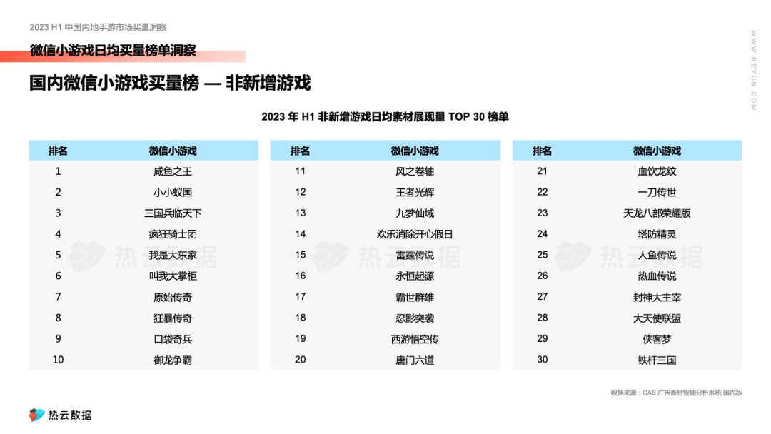 具体到产品,《咸鱼之王》《小小蚁国》《三国兵临天下》位居非新增游戏日均买量榜前三,《疯狂骑士团》《我是大东家》等游戏也处于榜单前列;