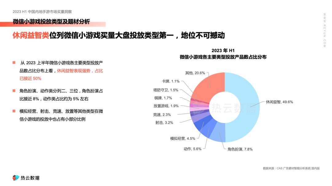 从参与投放的微信小游戏类型来看,休闲益智类占比接近50%,角色扮演、动作类分列第二、第三名,分别占比7.8%和5.6%;