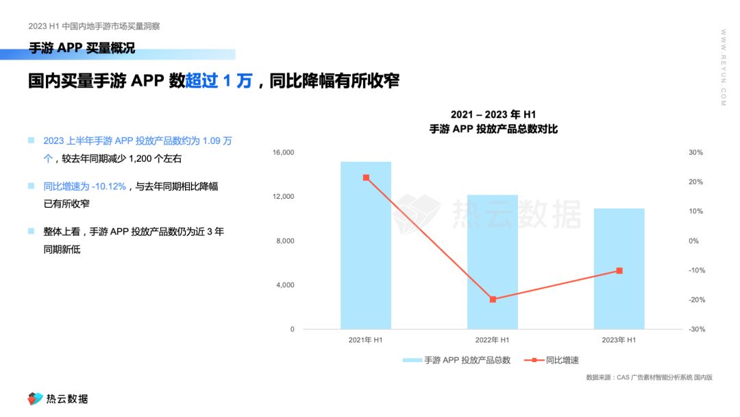 2023上半年,手游App买量市场依旧低迷,买量手游App数约为1.09万个,达到近3年来的最低值,同比增速为-10.12%,较去年有所收窄。