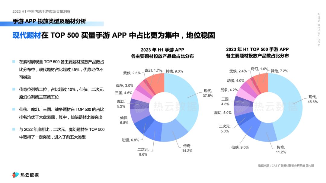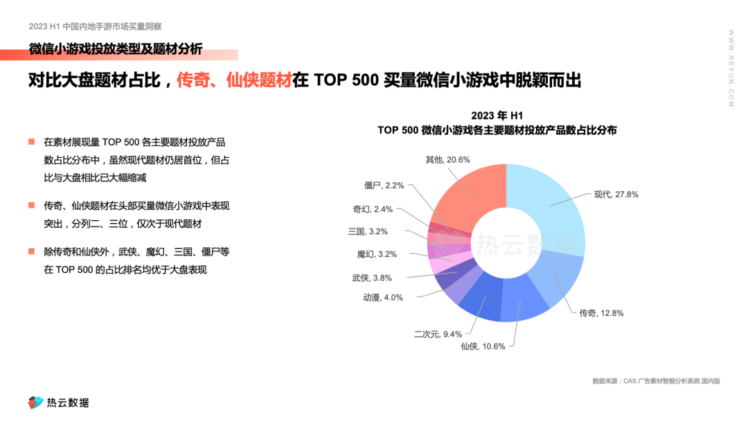 TOP 500题材分布中,现代题材仍居首位,但占比与大盘相比已有缩减,传奇、仙侠题材在头部买量微信小游戏中表现突出,分列第二、第三名。