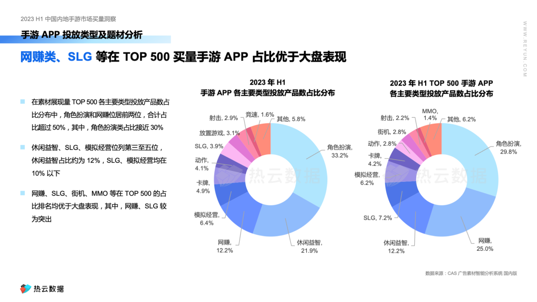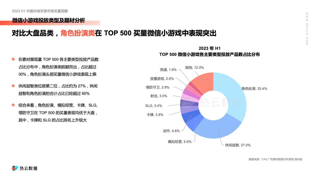 在素材展现量TOP 500 类型分布中,角色扮演类和网赚类位居前两位,合计占比超过50%,余下TOP 5依次为休闲益智、SLG和模拟经营类,分别占比12.2%、7.2%和6.2%。