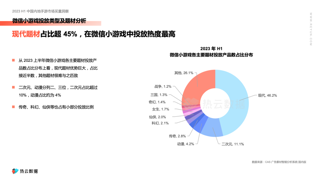 微信小游戏投放题材方面,现代题材依旧保持巨大优势,占比接近半数;二次元、动漫分列第二、第三名,占比为11.1%和4.2%;