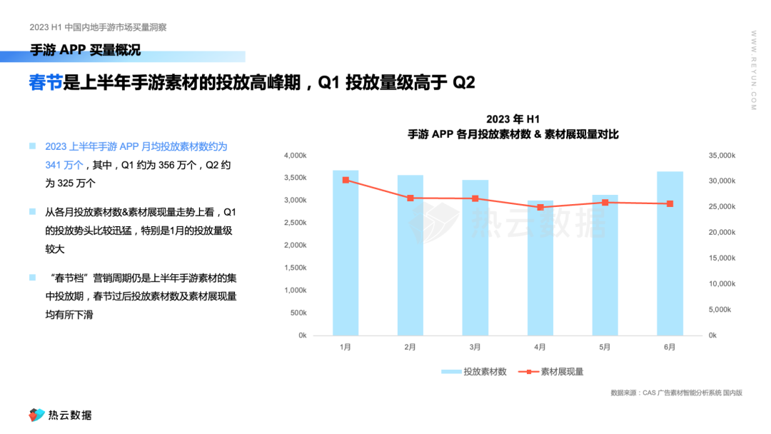 从各月投放素材数及素材展现量走势上看,今年Q1手游的投放势头较强,月均投放素材数约为356万,其中1月的「春节档」是上半年手游素材的集中投放期,同期手游买量激活率明显提升,为上半年的峰值。