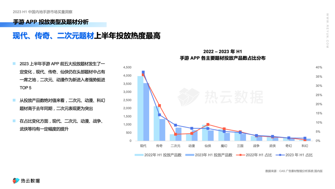 跟稳定的投放类型相比,2023上半年手游投放题材变化较大,二次元和动漫类产品作为黑马冲进TOP 5,蚕食了不少其他题材的投放份额;从投放产品数绝对值来看,也只有二次元、动漫和科幻类题材素材数量实现同比增长,其中二次元类素材数量增长最明显。