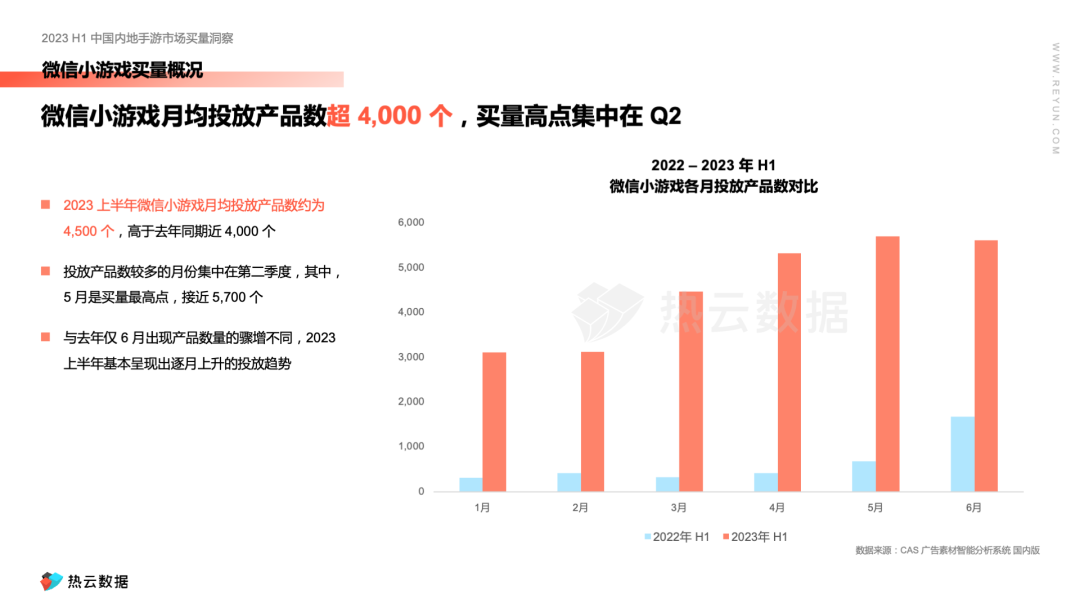 从各月投放数量走势来看,微信小游戏投放产品数集中在Q2,且今年的买量趋势基本呈逐月上升。