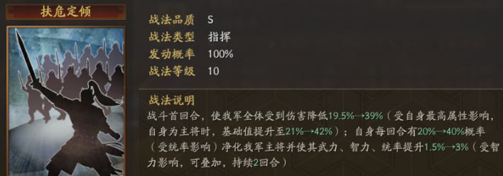 整军经武看起来是一个减伤+增益的切换战法,也是为数不多受伤降低的词缀,但是仅在奇数回合生效的减伤,实际上可能造成不稳定。至于偶数回合的统率、智力提升30点,首先这两个属性本身也都是影响防御的属性,也意味着带有一定的减伤效果。