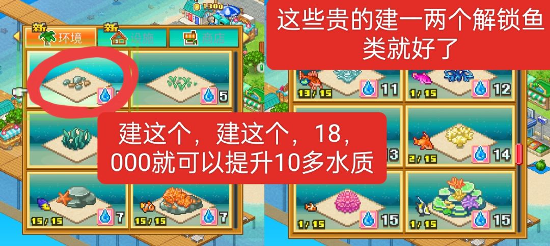 水质一定要注意!!!!建石头!建石头!!!,别看它只写着5水质,连着建一个可以加十多水质而且它很便宜,性价比最高。60,000以下的可以建十五个把鱼填满,以上的就建一个解锁鱼类就好了