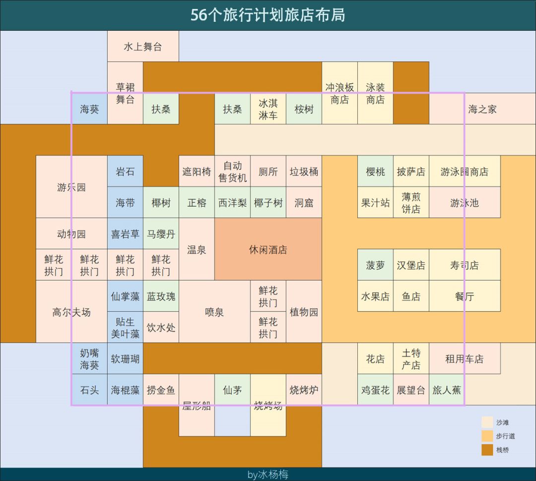 建的差不多了,在建五号那个正方形小岛,我没按水饺的原图建,第一填海太花钱,第二感觉那个岛没什么用,所以改成56旅行计划注意休闲酒店的落脚点要是陆地,不能是木桥