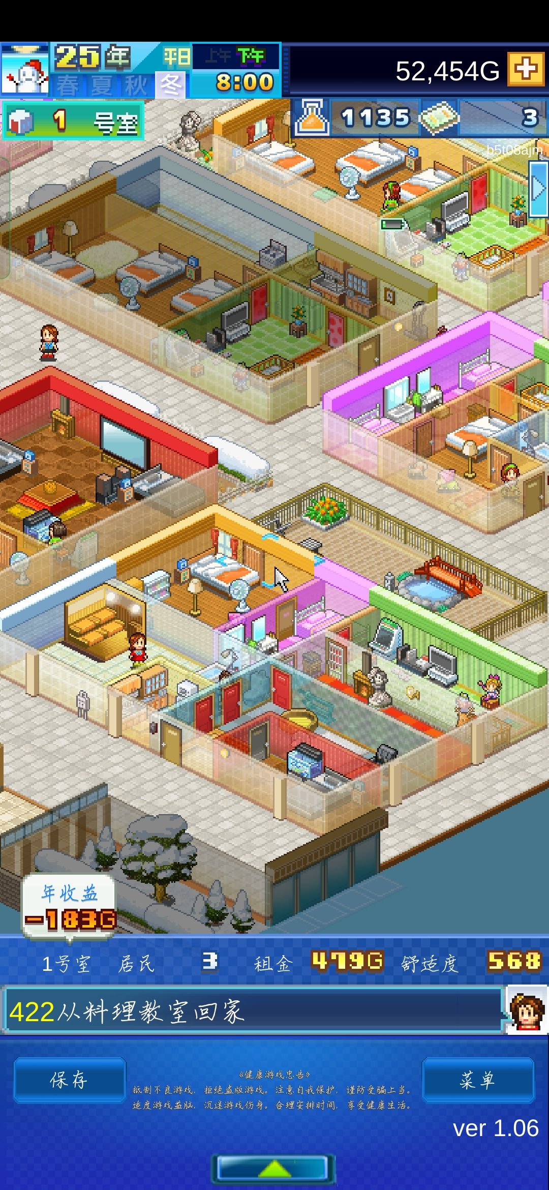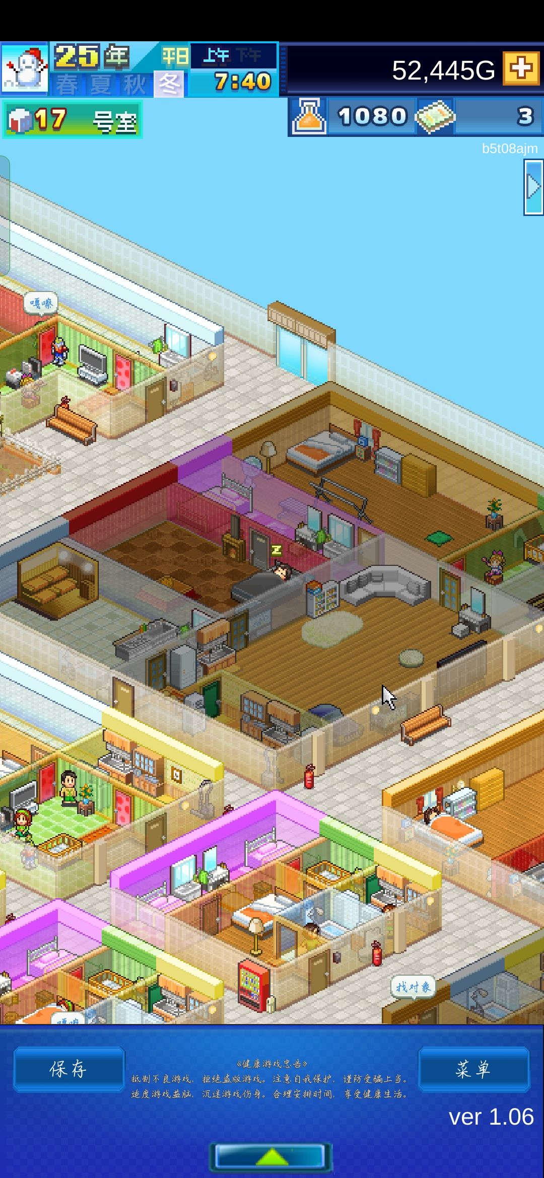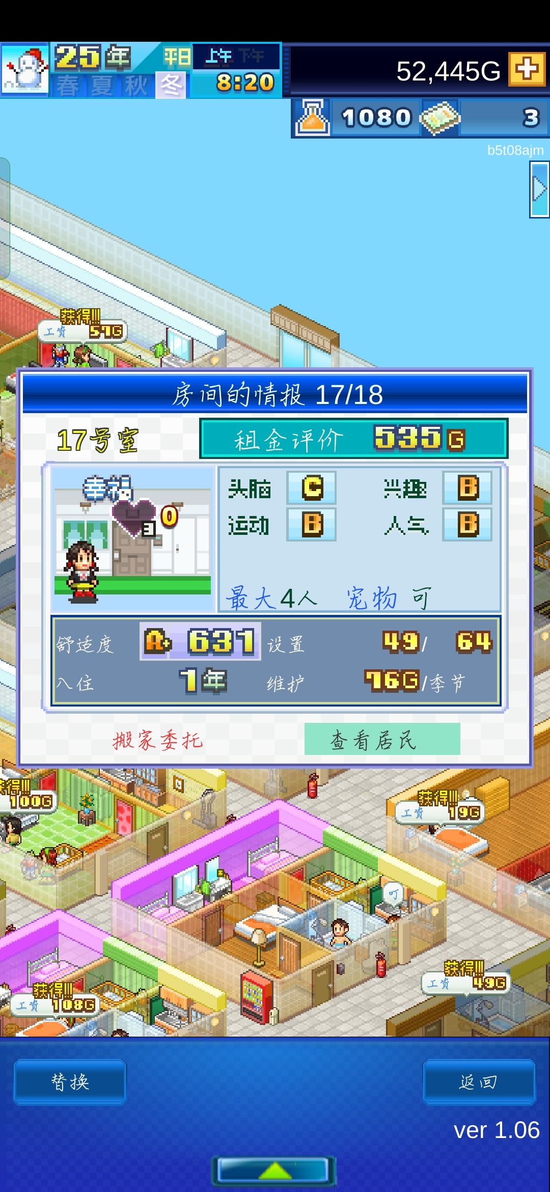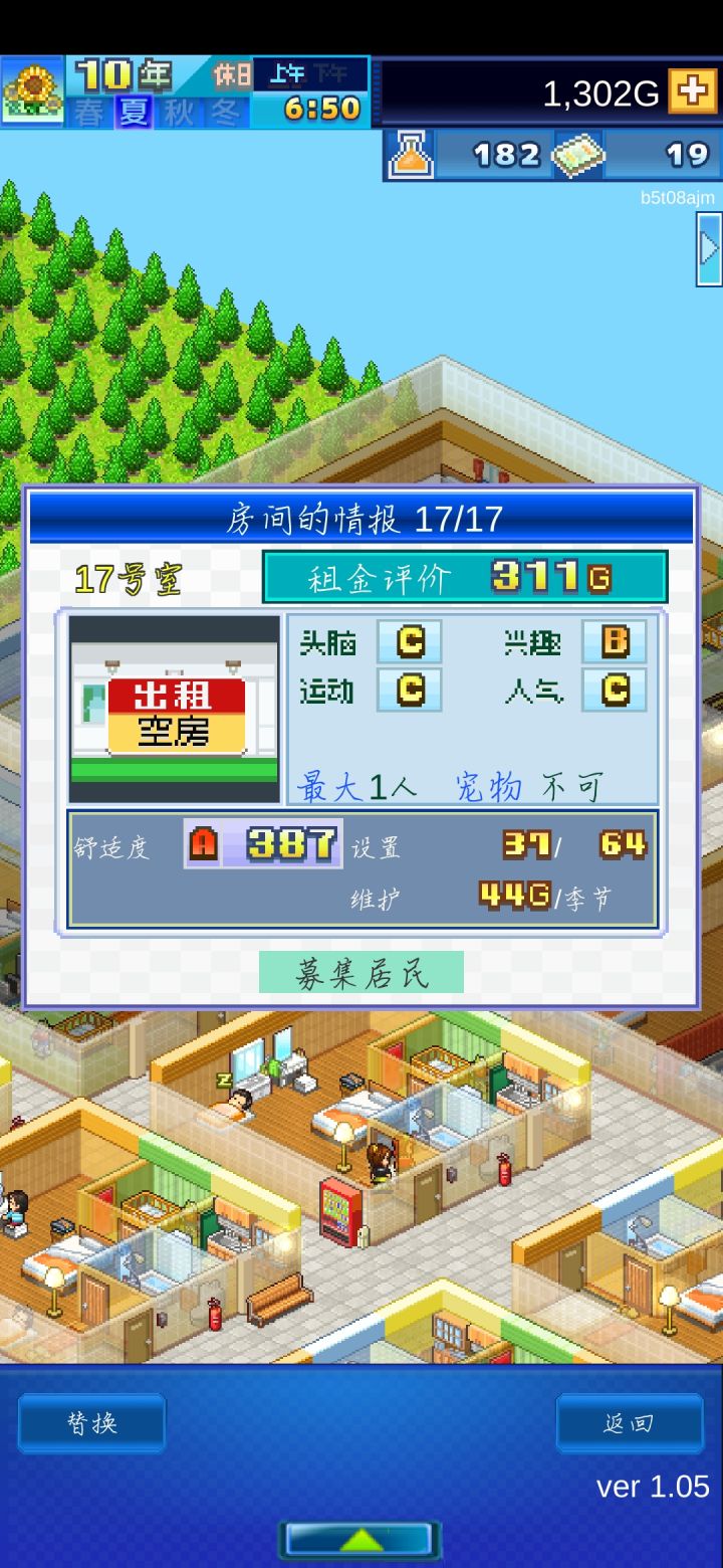 最后就是三图开局一大,四中,四小,共计9个房间,这样就是个很庞大的开局了。【所以这个图所有广告的票票一定要预留75去招募那个开罗工作者,因为他的魅力和兴趣换套衣服就可以直接冲第一了】基本三图10年左右就能招募他了,算了一下3年舒适度+3年租金+1次头脑+1次运动整好就可以用了