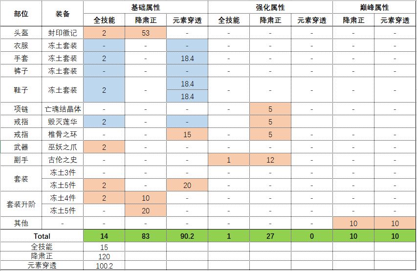 元素穿透:套装4件+神话戒指,5件装备出3条平均18.4以上的元素穿透,即可满足100元素穿透;