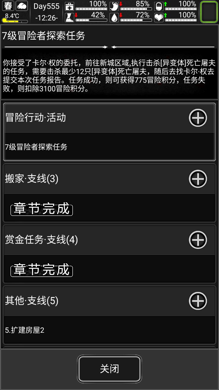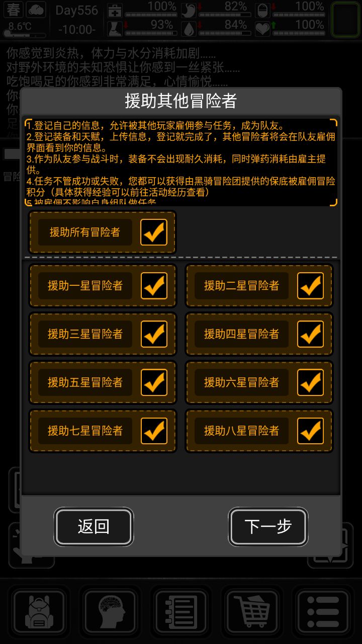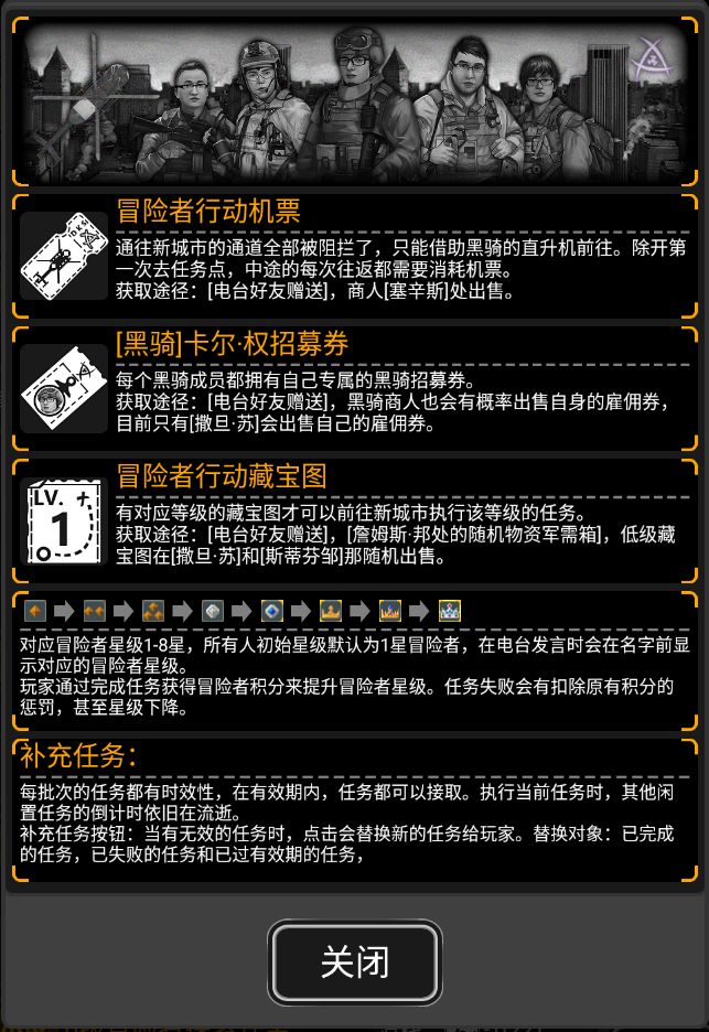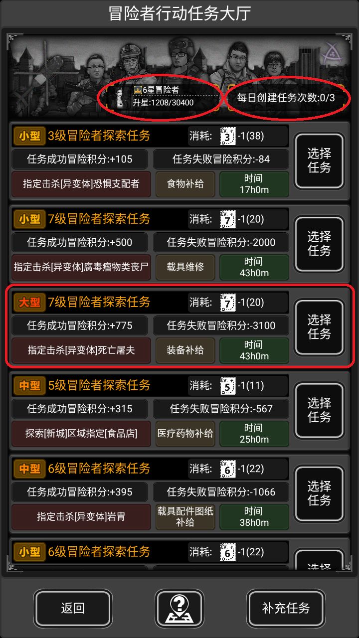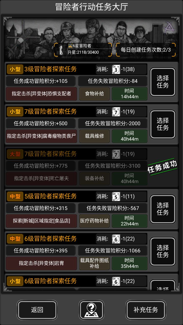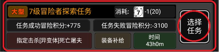 最下方,左侧为返回冒险者行动集合点,中间为部分解释和说明,右侧为补充任务