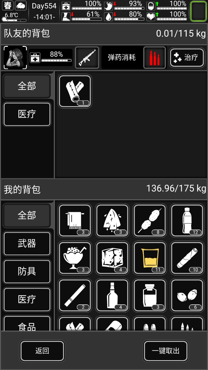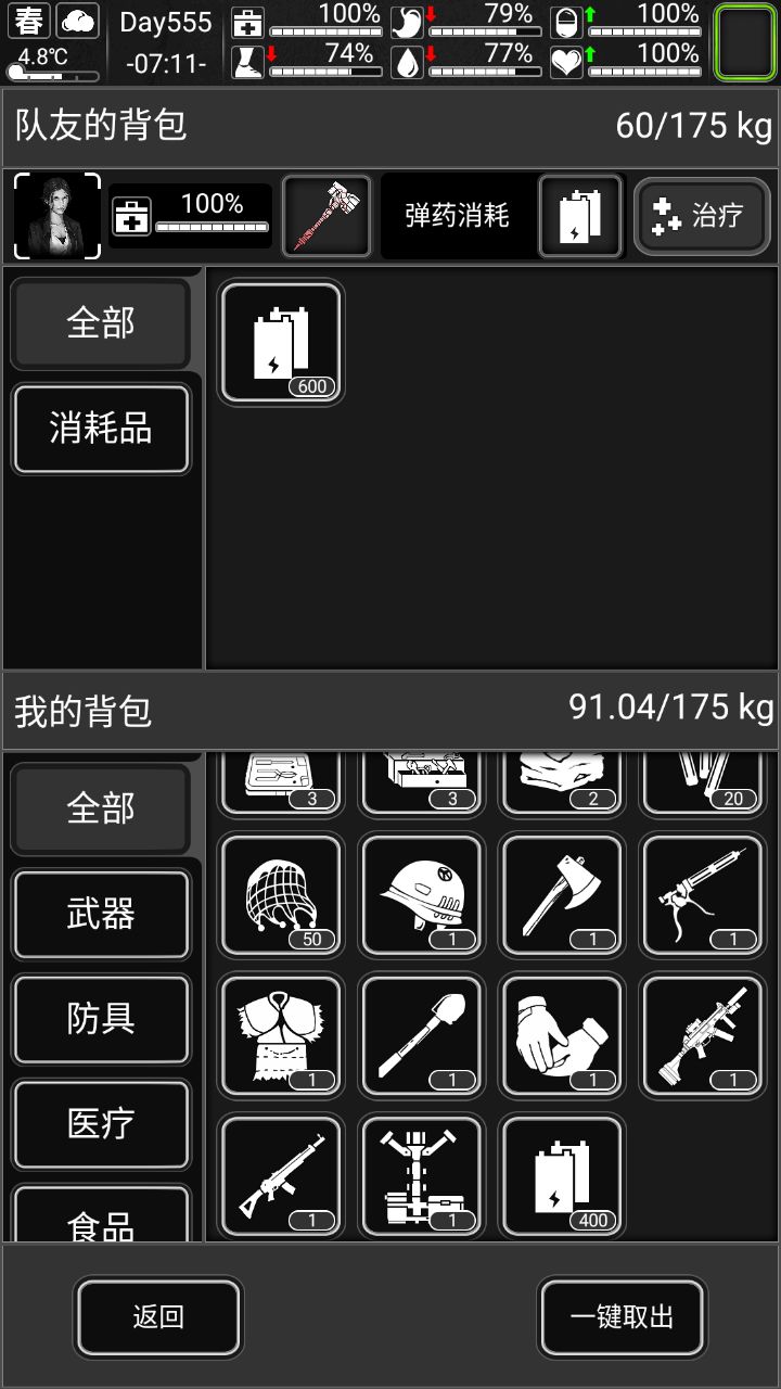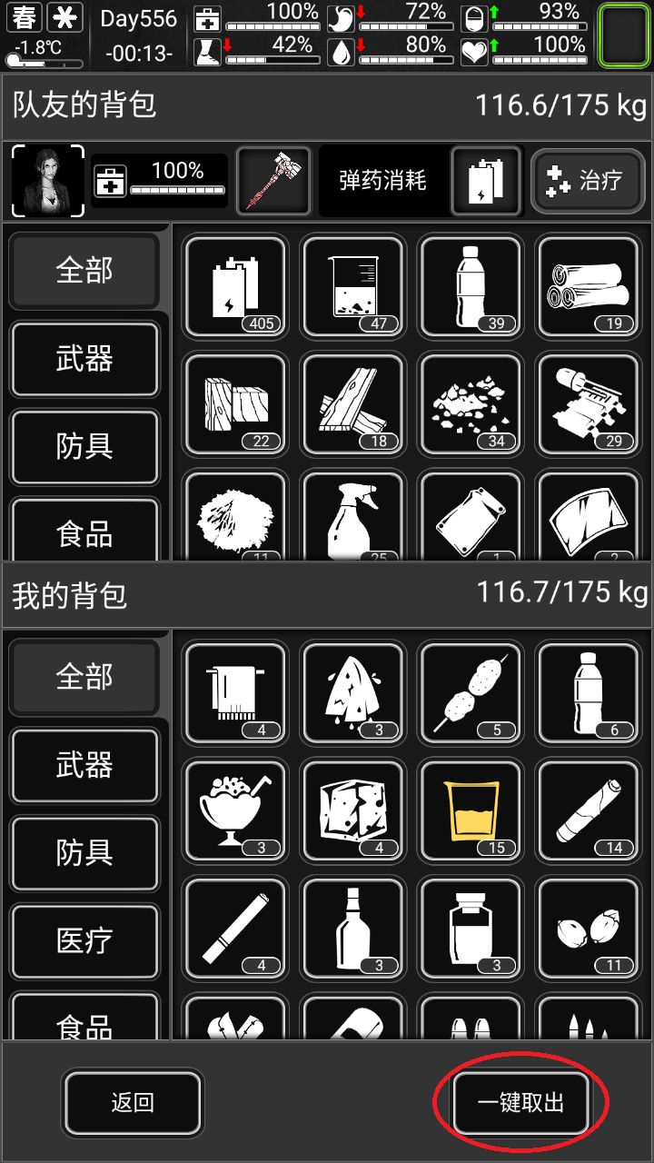 如下为队友背包界面,这里右下角的一键取出,会受自己背包的负重限制