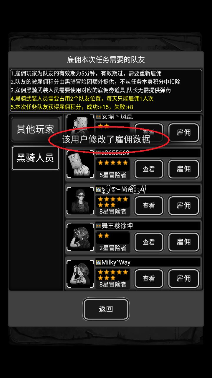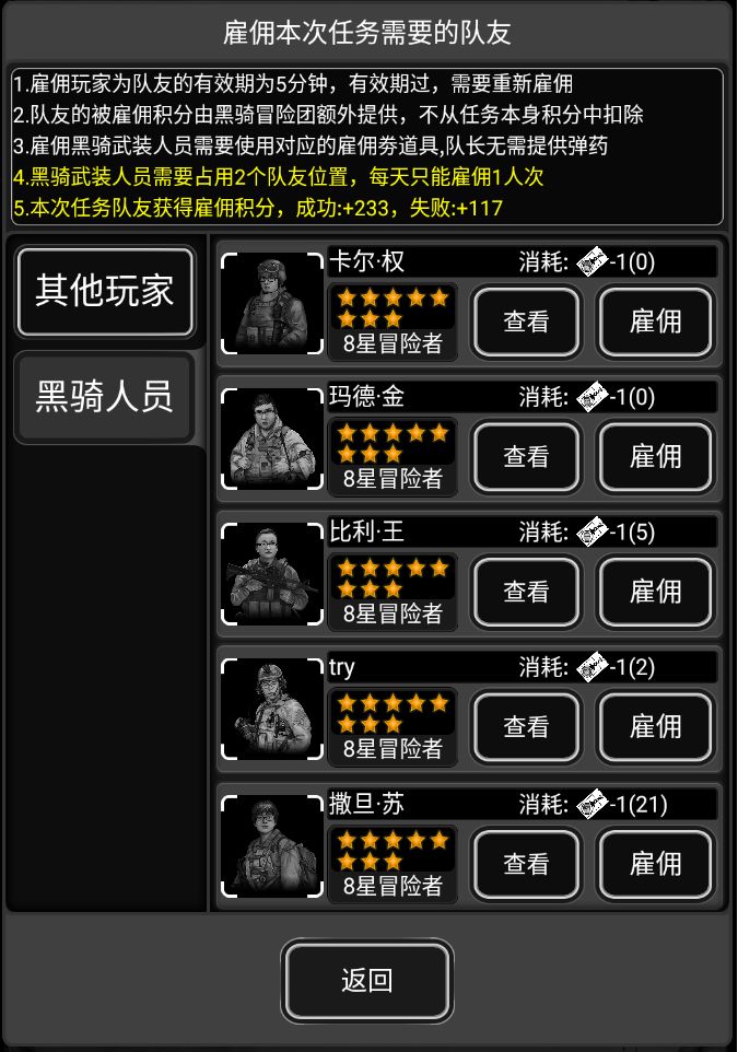 由于有部分人(一般是星级较高、不希望被关的人),会在援助登记的时候,只登记高级任务,那么在低级任务的雇佣界面,这个人也会出现在雇佣列表,但是无法雇佣,显示如下