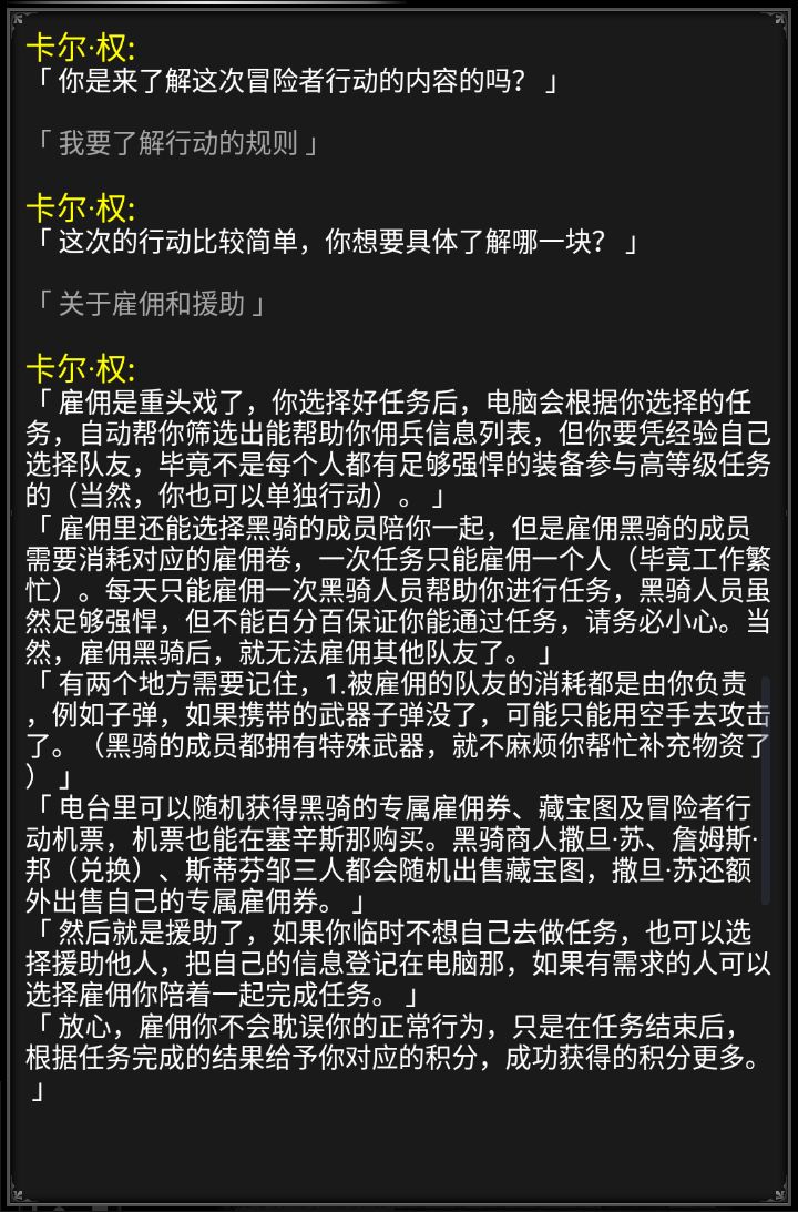 一般只和卡尔·权、通讯终端机(电脑)、直升机补给仓库,try互动对话,