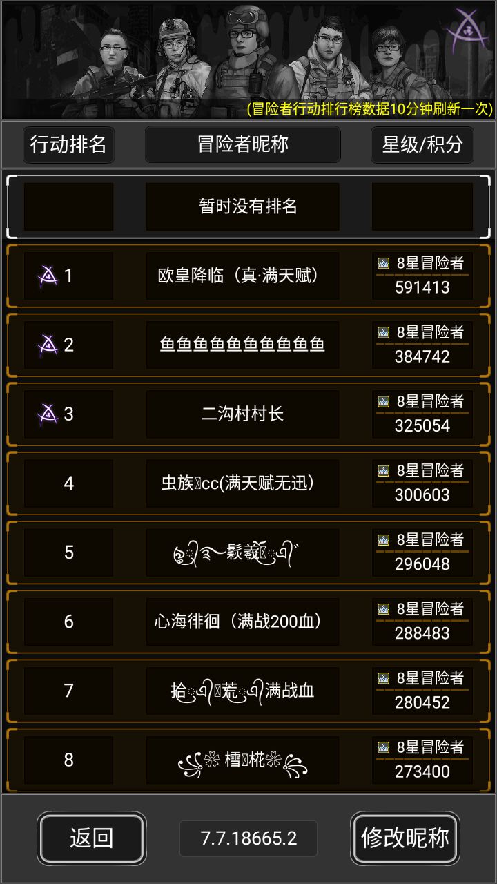 几颗星即几星冒险者,游戏昵称,冒险者星级,冒险者积分(总积分),冒险次数记录。