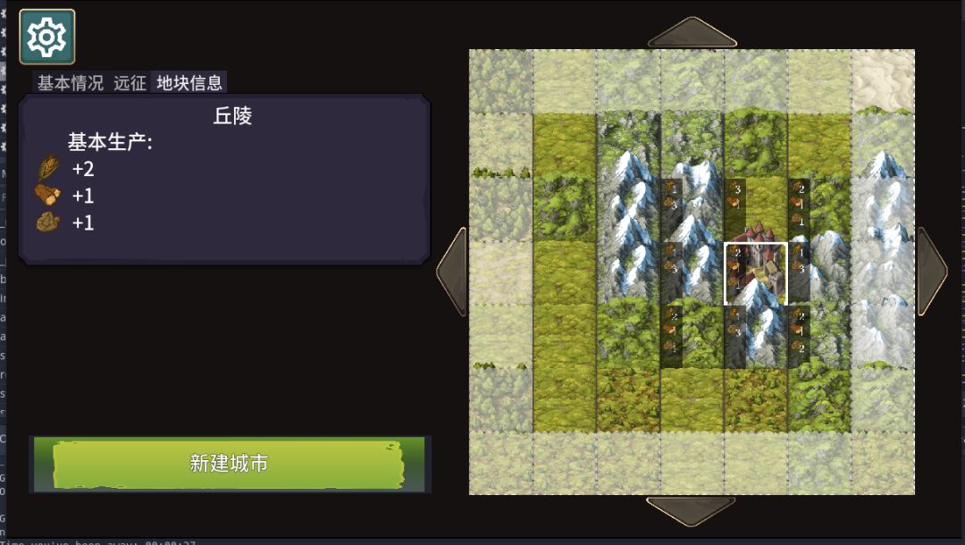 2.在右侧的7X7方格中,选择自己城市初始建立的位置,还可以点击四周的三角按钮来移动7X7方框位置(备注:千万不要选一种地形呀= =|)