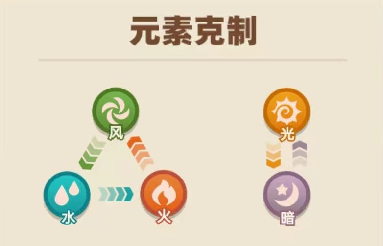 元素武器有剑、匕首、长柄、枪械、杖、弓、斧锤七种类型;有水、火、风、光、暗五种属性,携带元素武器的角色普攻时有30%的概率触发元素重击造成120%的伤害;当元素克制对方时伤害会提升至200%,而当元素被克制时则无法触发元素重击,具体的克制关系如下图所示。