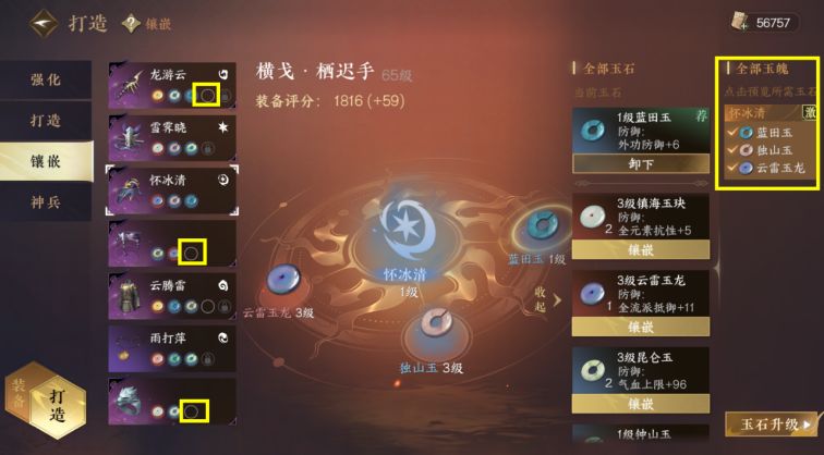 镶嵌:今天开启了6个玉石镶嵌孔位,3孔直接选择右边玉魄套装搭配即可,4孔同样选择玉魄套装搭配即可,套装加成评分更高!