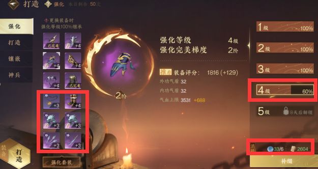 强化:优先把开启新等级的装备全部强化到4级,然后在补缀到完美!