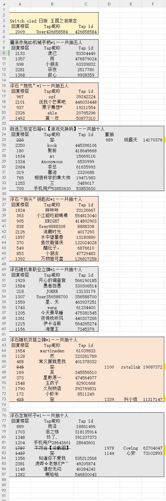 本次抽取中奖的方法是启用随机数字生成器,随机抽取指定数量的数字。最后根据数字定位到楼层数。截止到活动结束,最大的楼层数为2483,1楼为官方贴不计算在本次的抽取范围内。故本次截图抽奖活动的范围是2-2483。也就是说……大家成功的解锁了特别大奖——Switch OLED 王国之泪限定机!!!