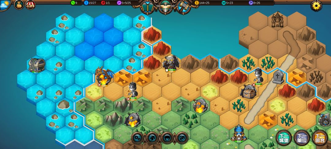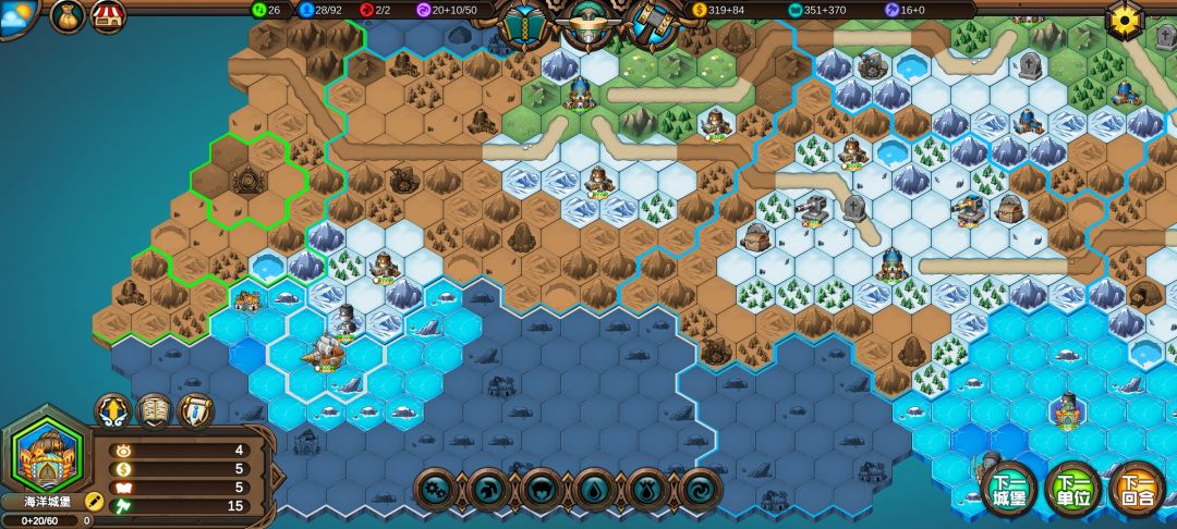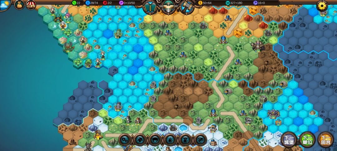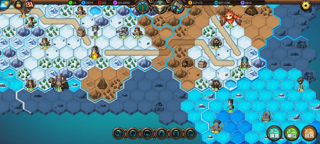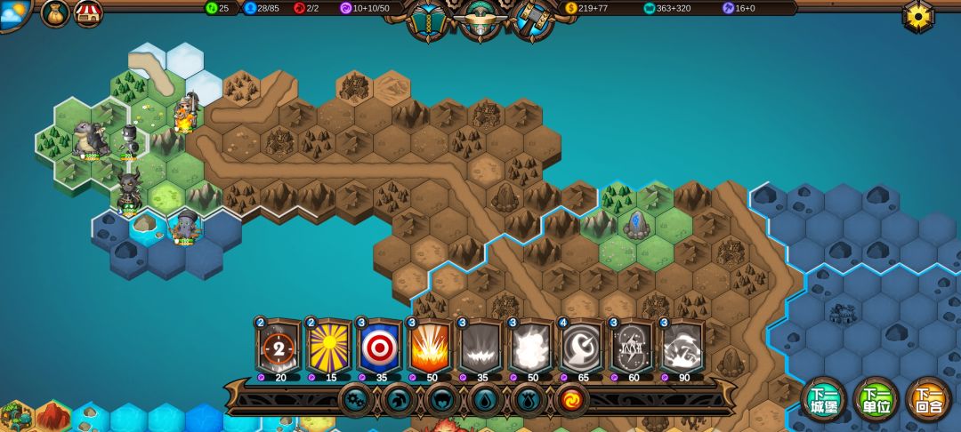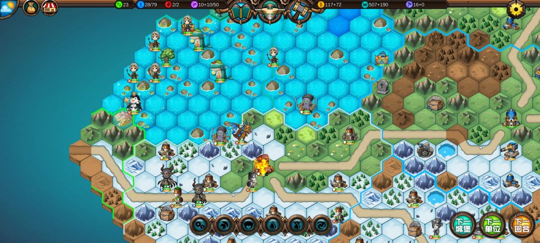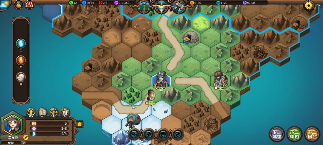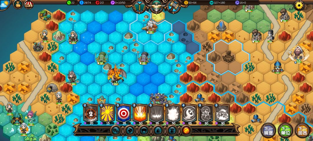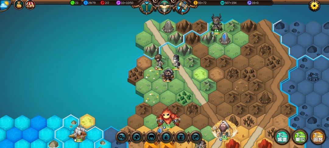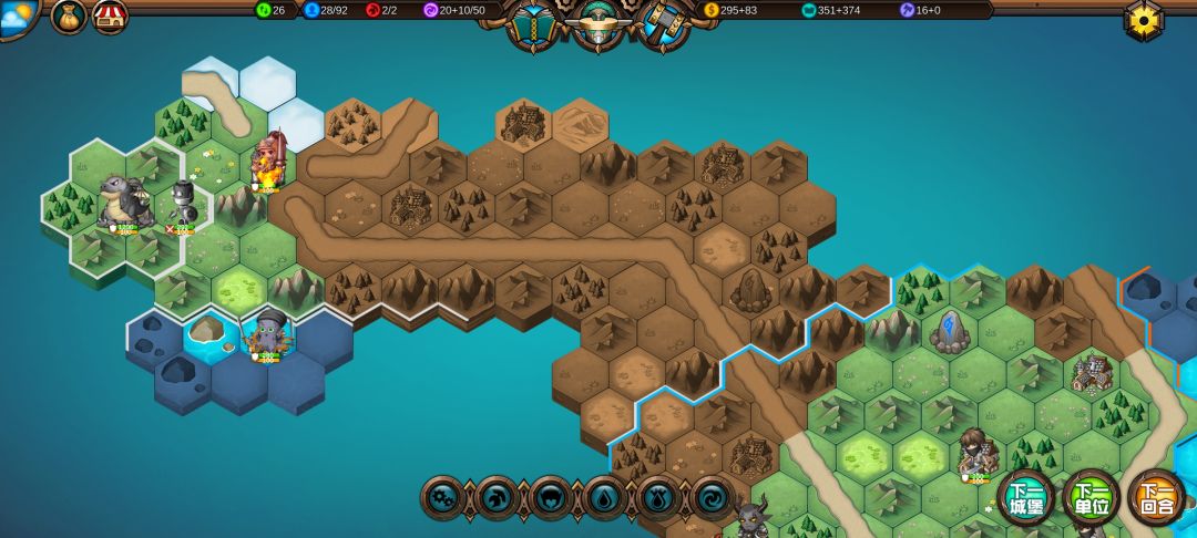 然后工程师先给土匪独轮减抗性,再让火炮A,然后走到丘陵上,5点视野真是广,看到家右边就有个海洋城堡,然后走城堡(下回合要捡箱子)