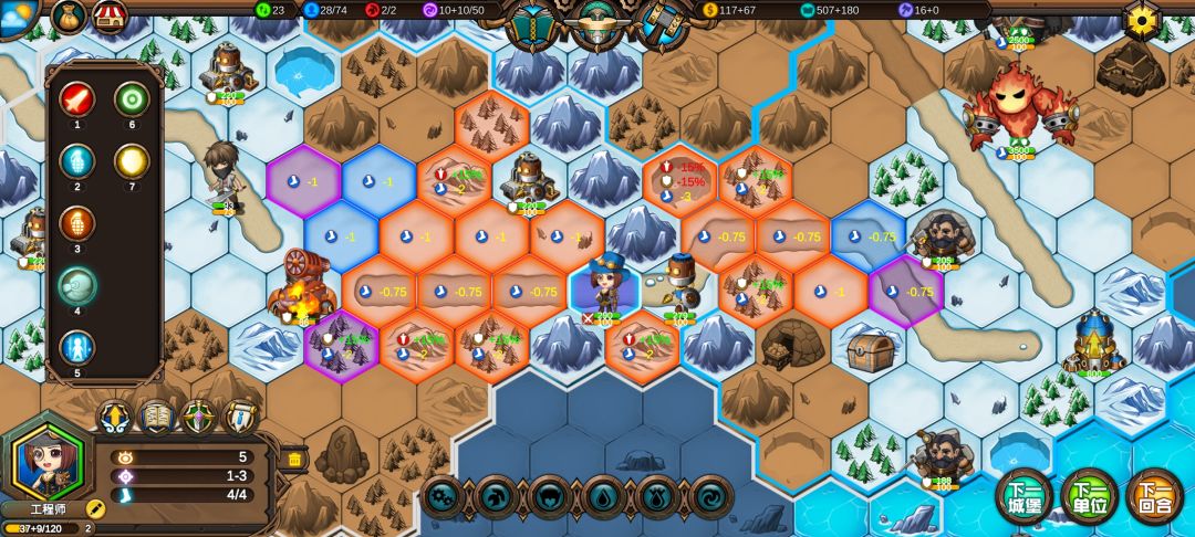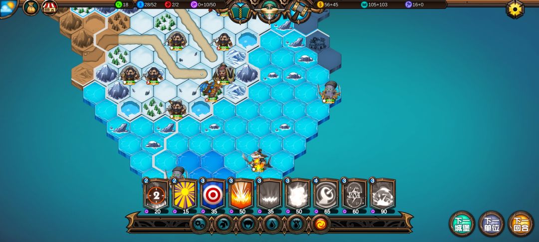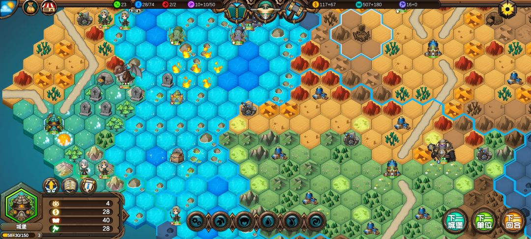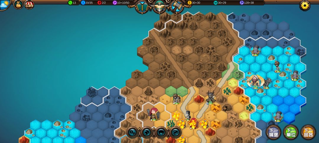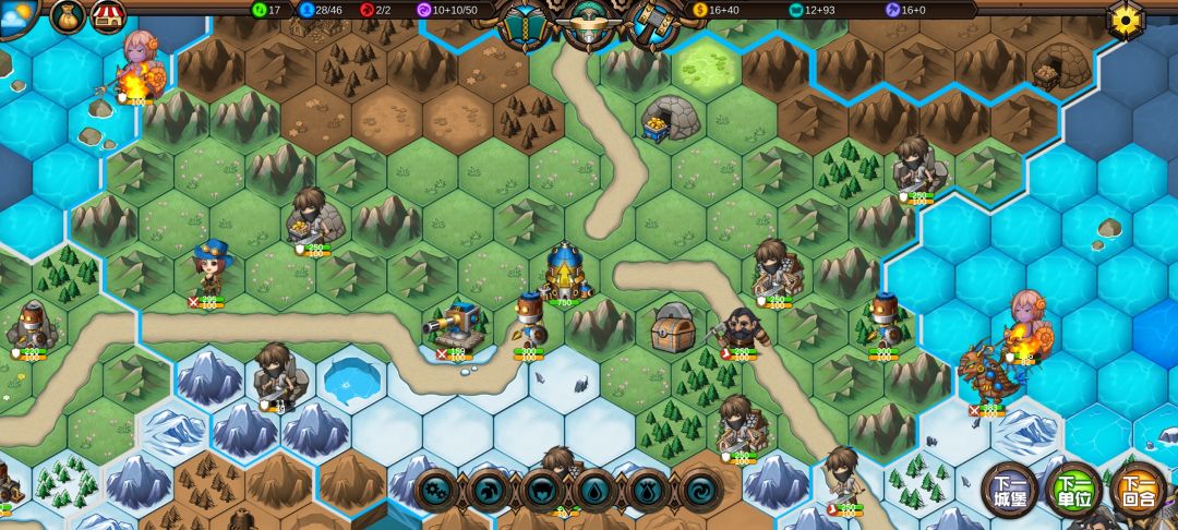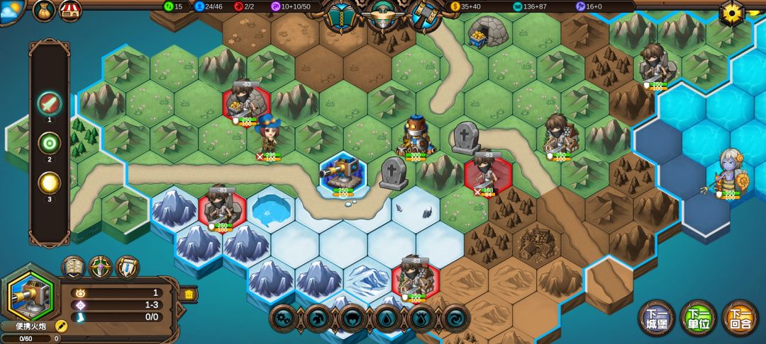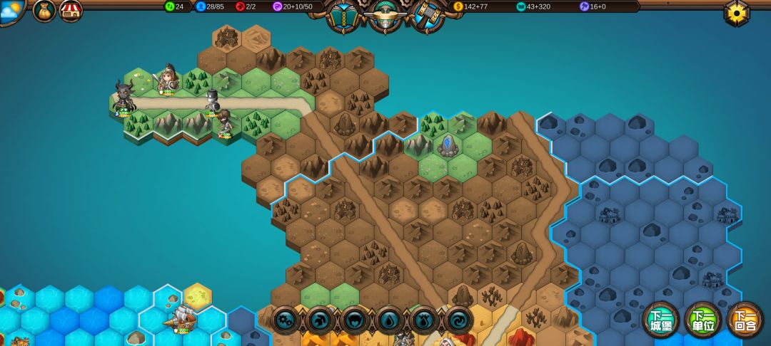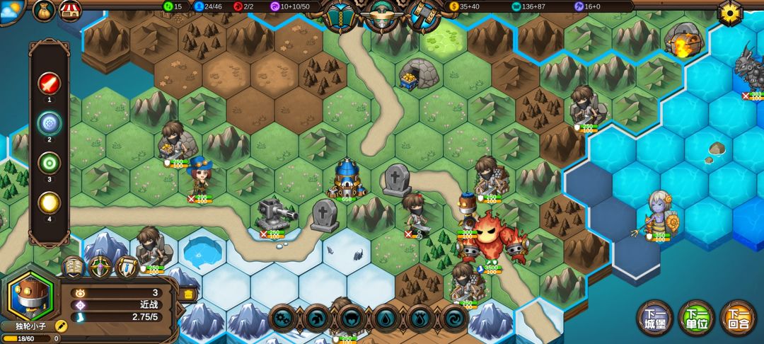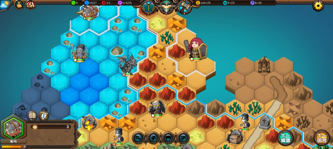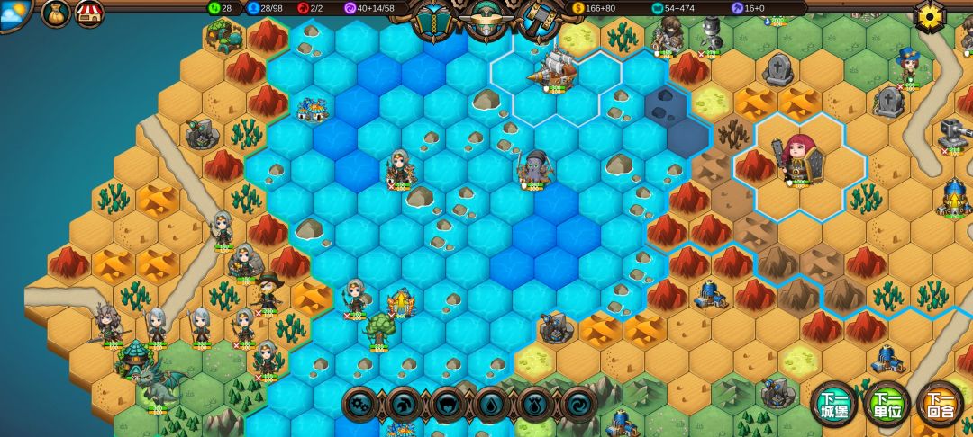 然后工程师先给土匪独轮减抗性,再让火炮A,然后走到丘陵上,5点视野真是广,看到家右边就有个海洋城堡,然后走城堡(下回合要捡箱子)
