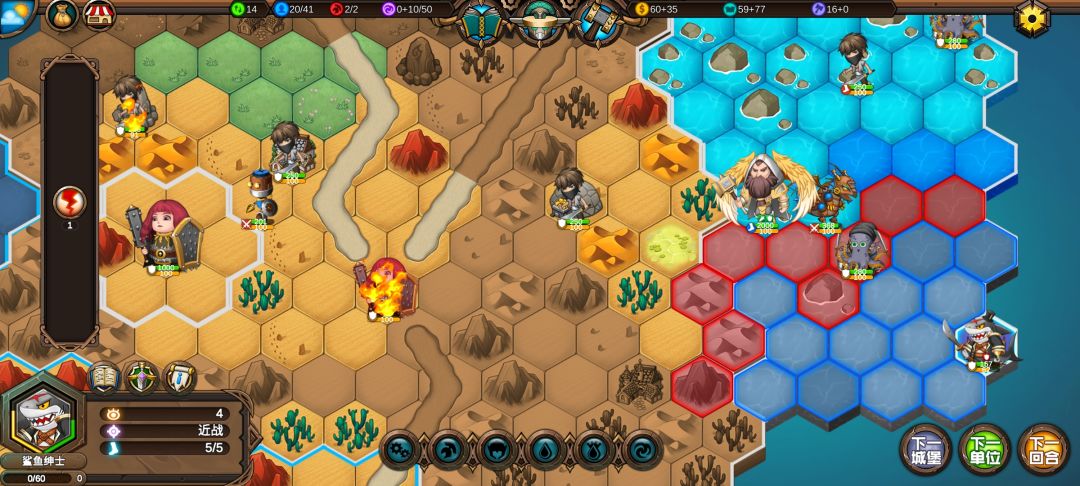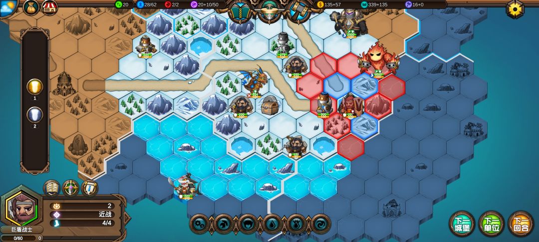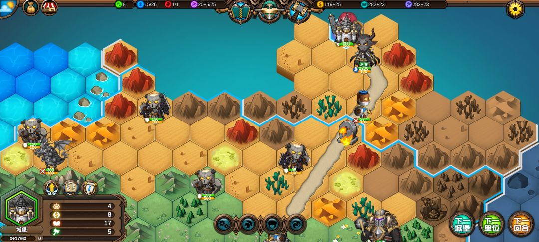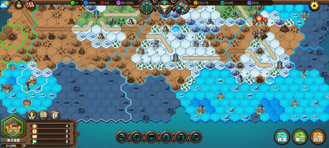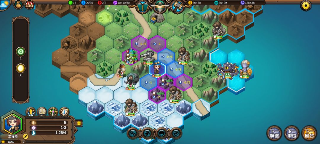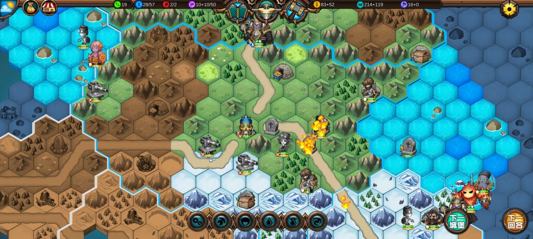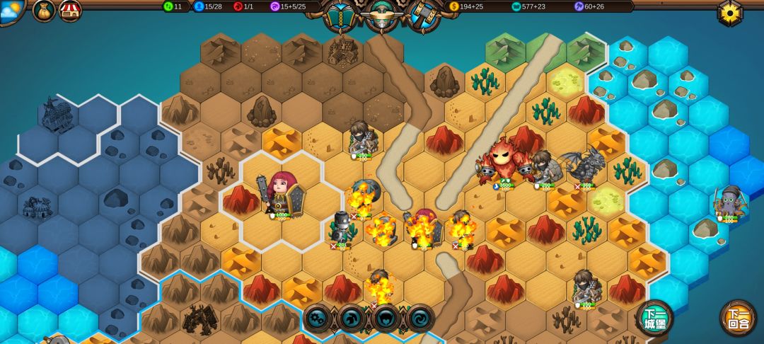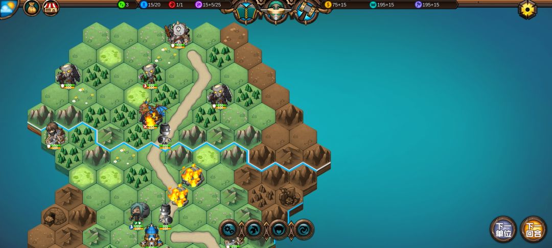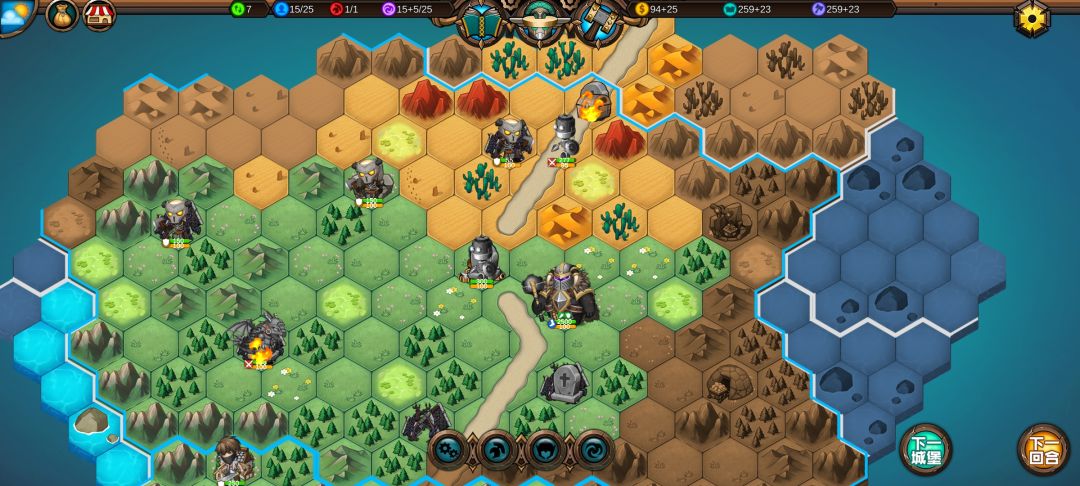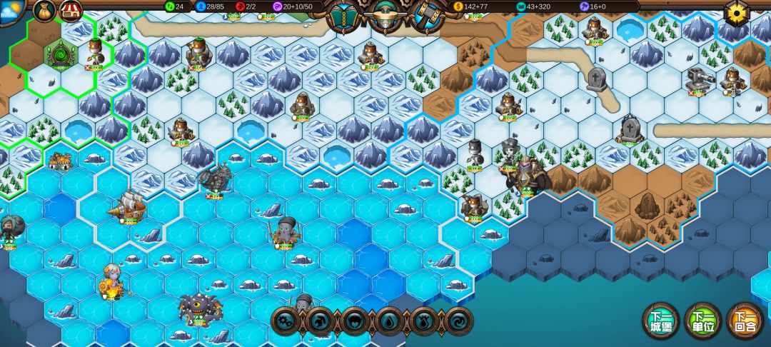 然后工程师先给土匪独轮减抗性,再让火炮A,然后走到丘陵上,5点视野真是广,看到家右边就有个海洋城堡,然后走城堡(下回合要捡箱子)