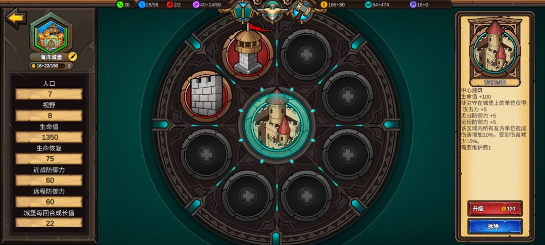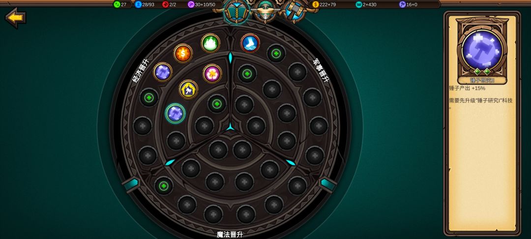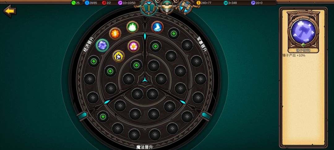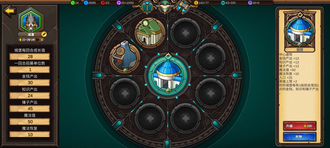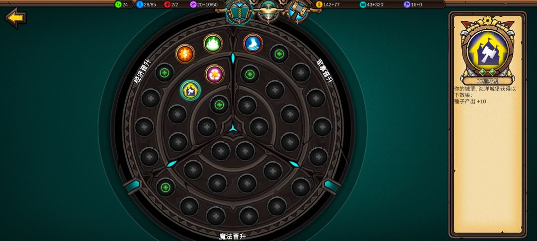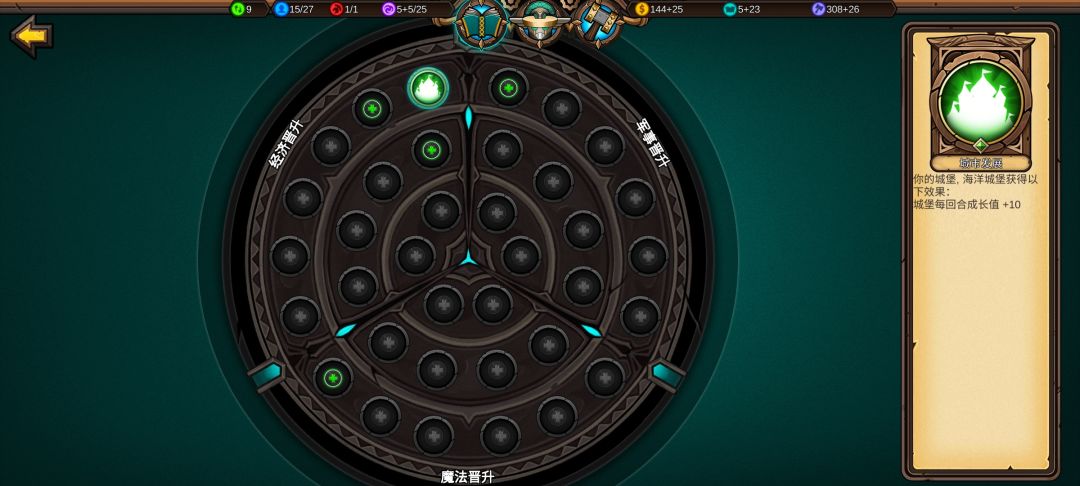 城市发展可以让我更快建造铁匠铺、更快升本,城堡等级高后面造魔法城堡获取的魔法值更多